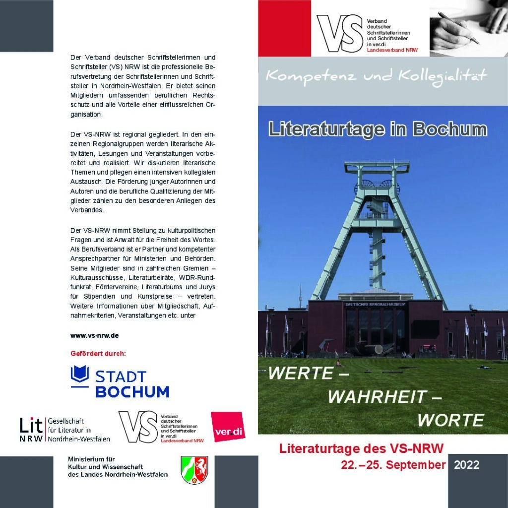 Vier Tage lang tritt im September die bunte nordrhein-westfälische Literaturszene in Bochum auf. Mit dem Motto “Werte-Wahrheit-Worte” präsentieren sich die Literaturtage des Verbandes deutscher Schrift-stellerinnen und Schriftsteller ( VS ). Sie bieten ein reichhaltiges Programm mit zahlreichen Veranstaltungen an unterschiedlichen Orten an.